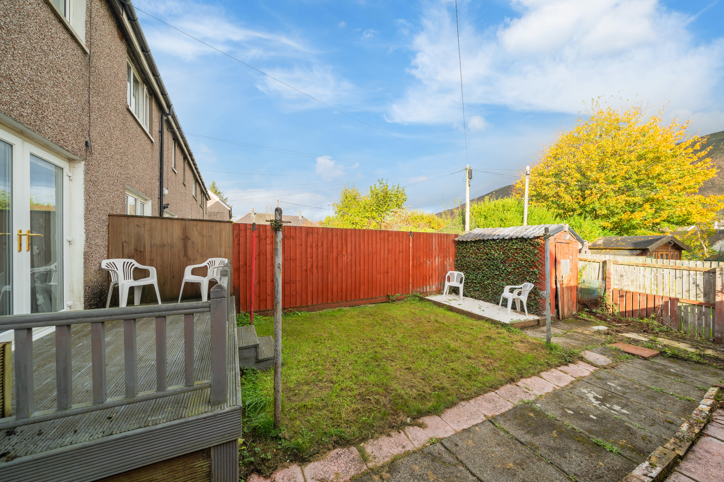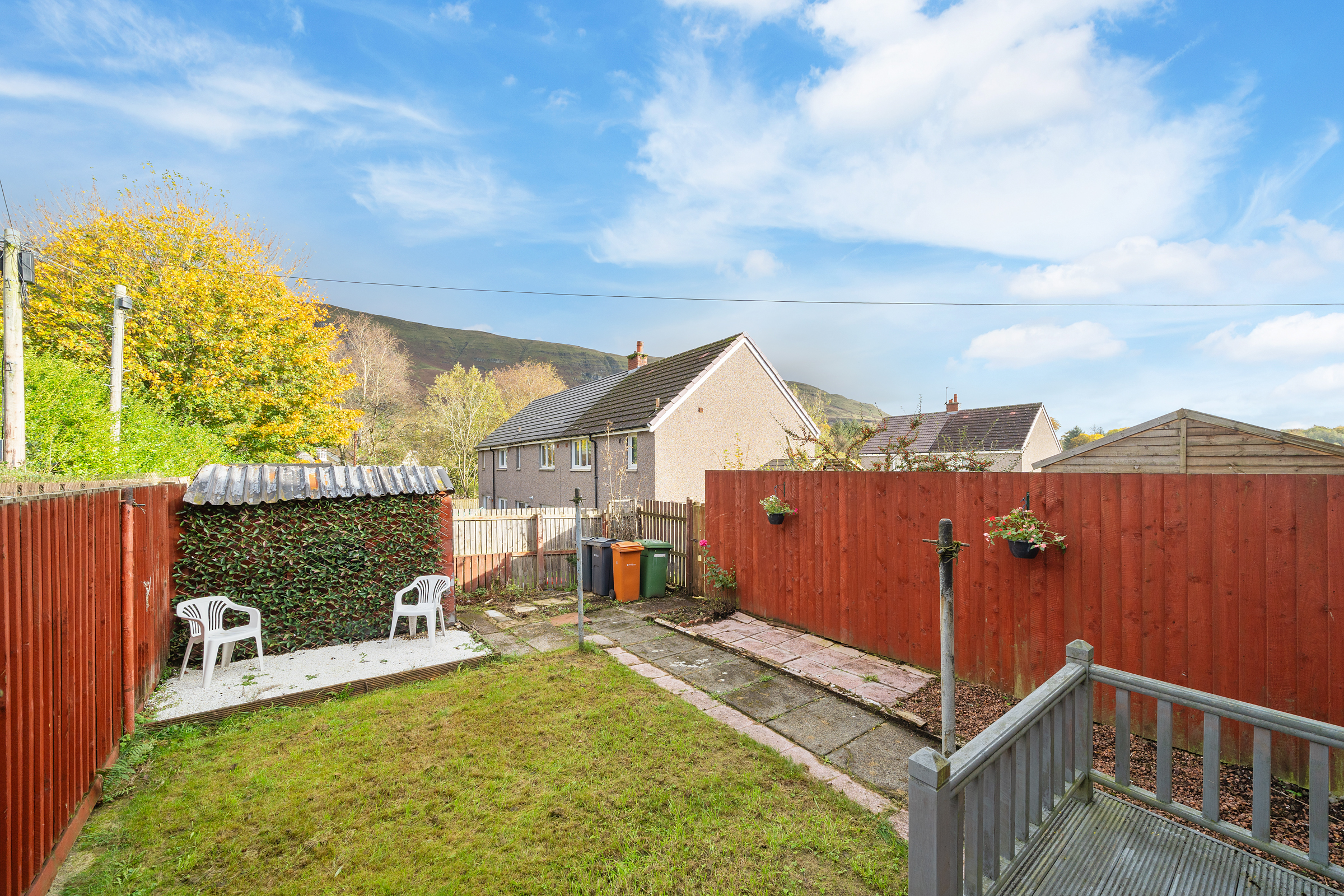 Passing the neat front garden with parking for one car, the hall opens into the lounge with a dining area to the rear. French doors to the decking area and a large front facing window allow plenty of light into this well-proportioned room. The view to the Campsie Fells is particularly attractive. The modern kitchen has base and wall mounted units with contrasting work surfaces. Included in the sale are the newly purchased gas cooker, the fridge/freezer and the washing machine. There is also a useful under stair cupboard for storing larger items. Upstairs, there are two double bedrooms, a single bedroom and a shower room.