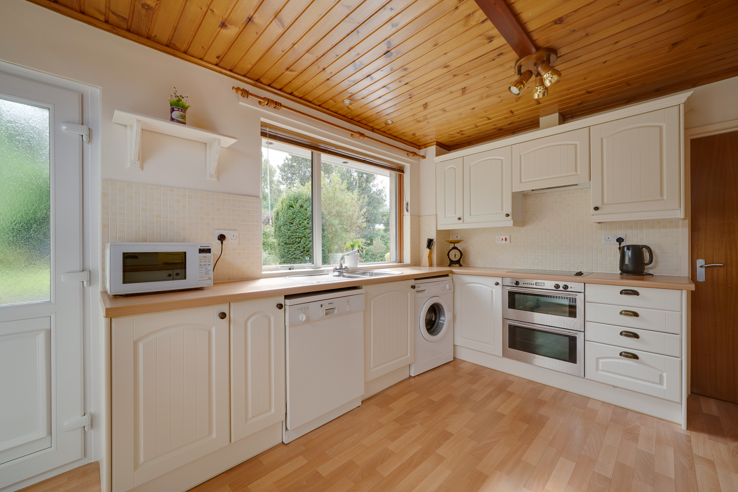 The kitchen, accessible from both the dining area and the hall, is generously sized with both base and wall mounted units. Included in the sale are the double oven, hob, extractor fan, dishwasher, fridge, freezer and washing machine. In particular, the view from the kitchen is most attractive as it overlooks the tranquil back garden and there is a back door leading to the patio area.
