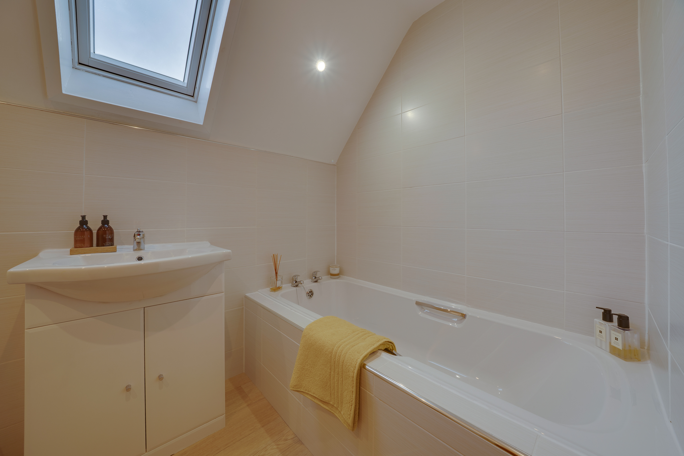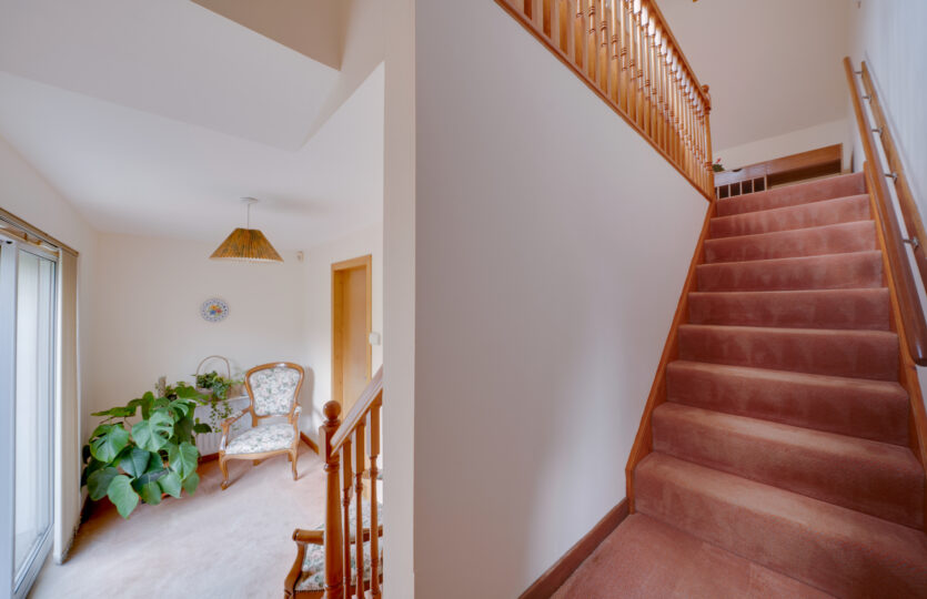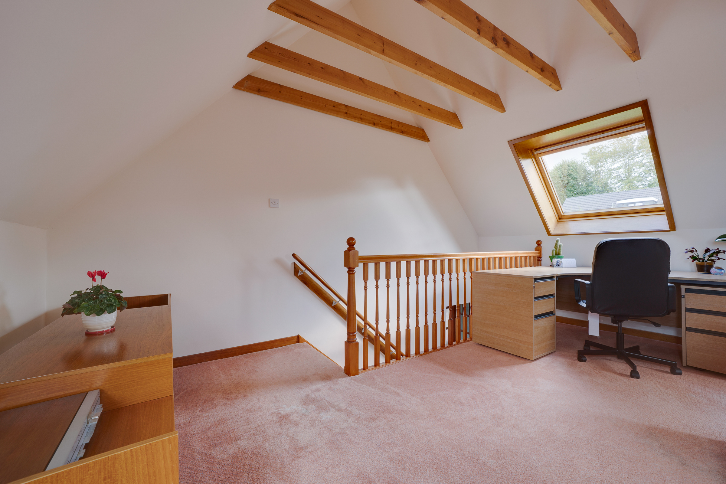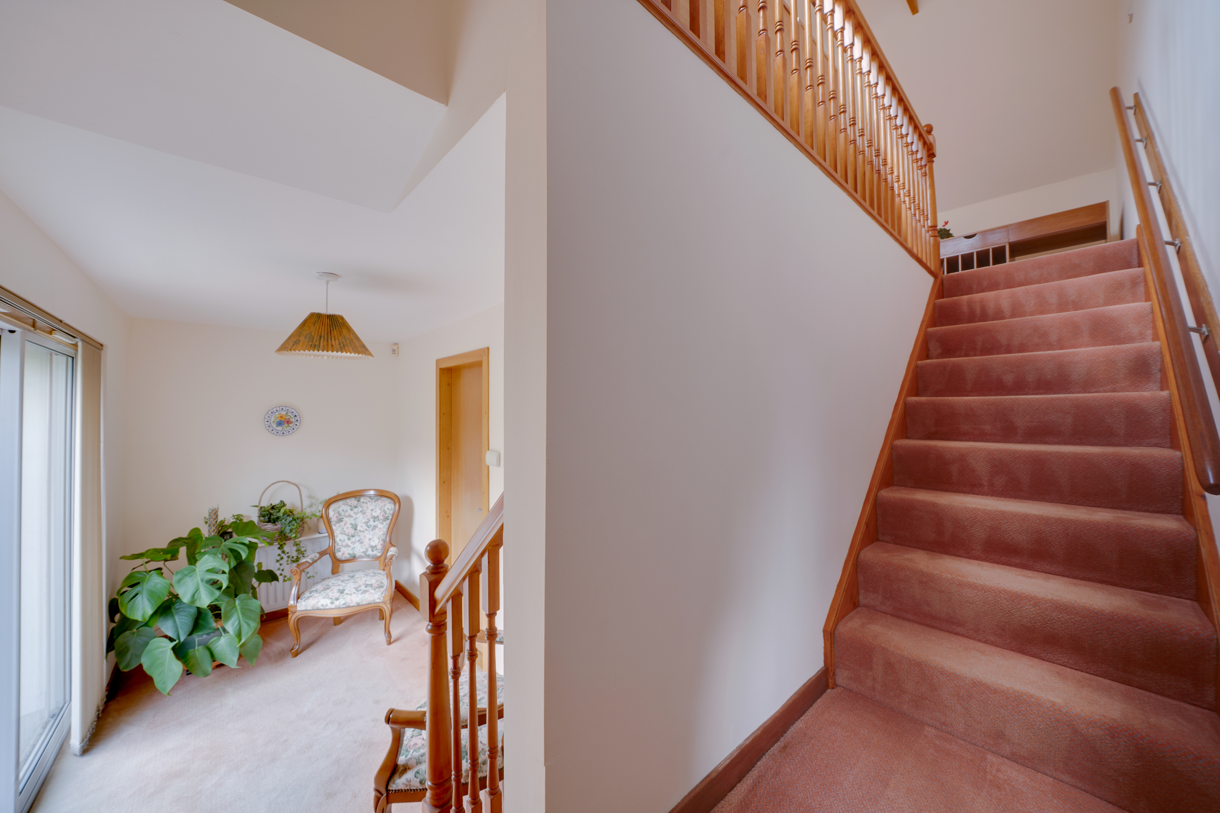 From the main entrance hall, stairs lead to the upper level where there are two well-proportioned double bedrooms with substantial built in wardrobes as well as access to the floored eaves, an ideal solution for storage of items used only occasionally. Peaceful views over the Campsie Fells add to the attractiveness of these rooms. The modern family bathroom is fully tiled in neutral tones and benefits from a separate shower cubicle. There is access from the upper landing to the fully floored and lit attic which provides more storage space.