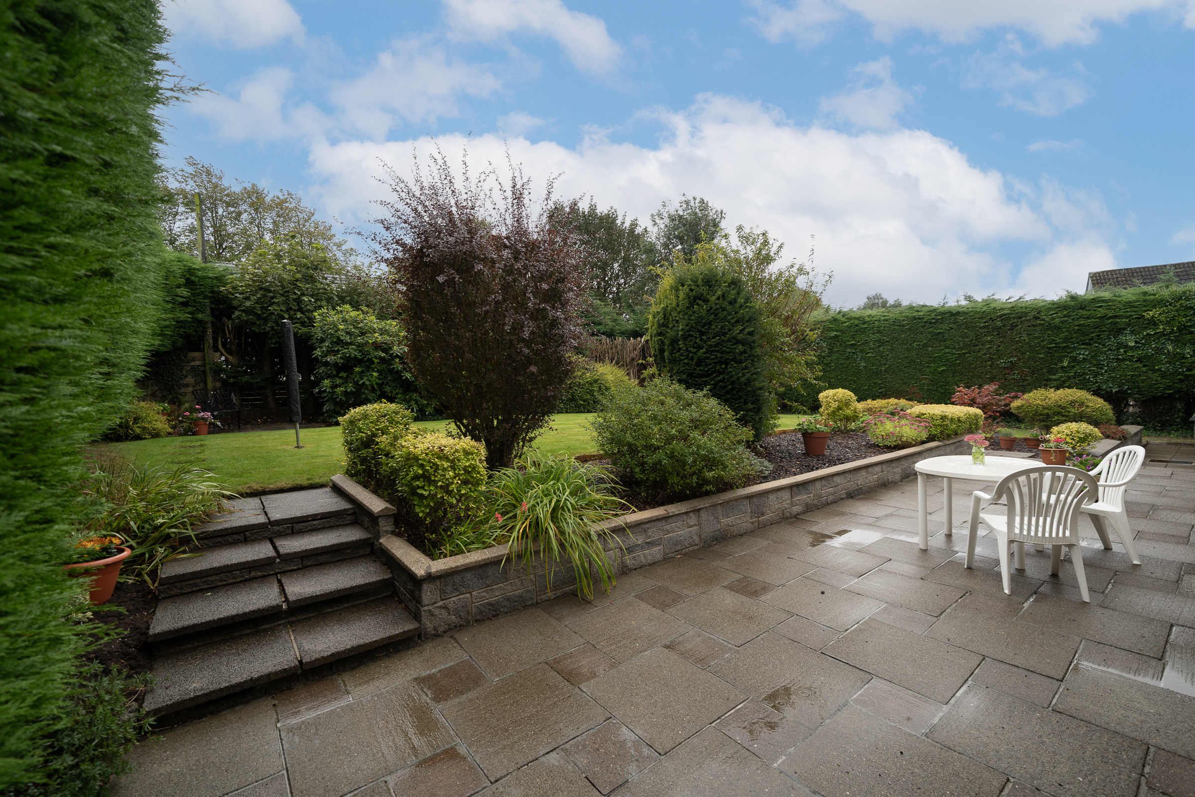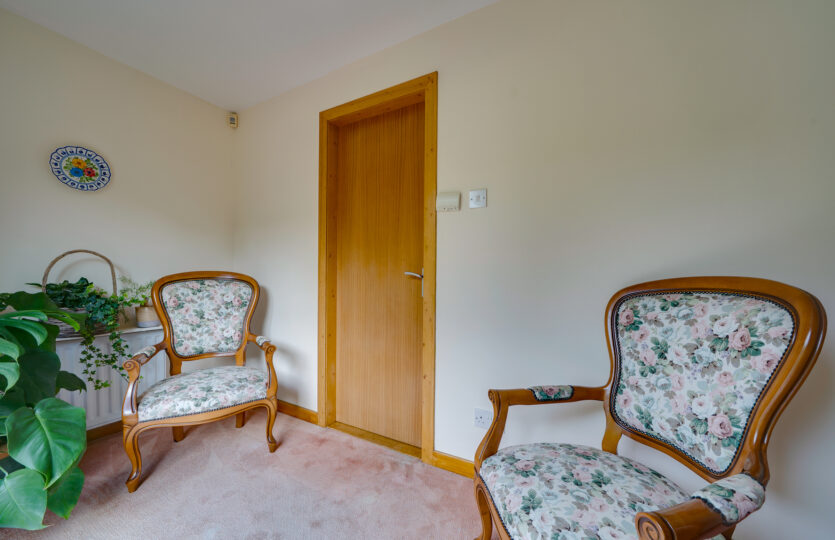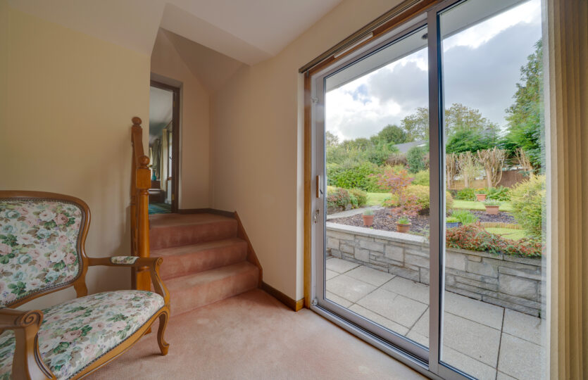 Returning to the lounge, a door opens to a cosy seating area with a relaxing view through patio windows to the back garden – a perfect sun lit corner for a quiet morning coffee. A door leads into the double garage.